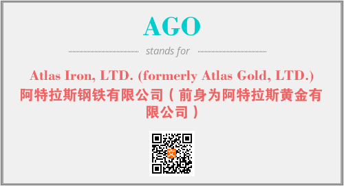 上述内容是“Atlas Iron, LTD. (formerly Atlas Gold, LTD.)”作为“AGO”的缩写,解释为“阿特拉斯钢铁有限公司(前身为阿特拉斯黄金有限公司)”时的信息,以及英文缩略词AGO所代表的英文单词,其对应的中文拼音、详细解释以及在英文中的流行度和相关分类、应用领域及应用示例等。