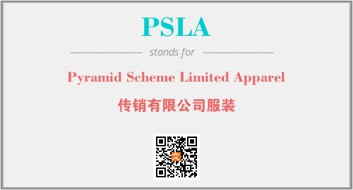 上述内容是“Pyramid Scheme Limited Apparel”作为“PSLA”的缩写,解释为“传销有限公司服装”时的信息,以及英文缩略词PSLA所代表的英文单词,其对应的中文拼音、详细解释以及在英文中的流行度和相关分类、应用领域及应用示例等。