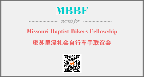 上述内容是“Missouri Baptist Bikers Fellowship”作为“MBBF”的缩写,解释为“密苏里浸礼会自行车手联谊会”时的信息,以及英文缩略词MBBF所代表的英文单词,其对应的中文拼音、详细解释以及在英文中的流行度和相关分类、应用领域及应用示例等。