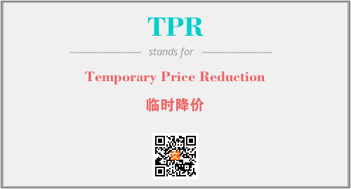 上述内容是“Temporary Price Reduction”作为“TPR”的缩写,解释为“临时降价”时的信息,以及英文缩略词TPR所代表的英文单词,其对应的中文拼音、详细解释以及在英文中的流行度和相关分类、应用领域及应用示例等。