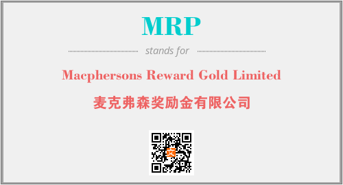 上述内容是“Macphersons Reward Gold Limited”作为“MRP”的缩写,解释为“麦克弗森奖励金有限公司”时的信息,以及英文缩略词MRP所代表的英文单词,其对应的中文拼音、详细解释以及在英文中的流行度和相关分类、应用领域及应用示例等。