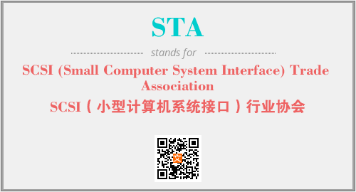 上述内容是“SCSI (Small Computer System Interface) Trade Association”作为“STA”的缩写,解释为“SCSI(小型计算机系统接口)行业协会”时的信息,以及英文缩略词STA所代表的英文单词,其对应的中文拼音、详细解释以及在英文中的流行度和相关分类、应用领域及应用示例等。