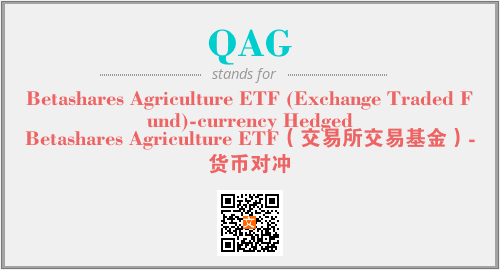 上述内容是“Betashares Agriculture ETF (Exchange Traded Fund)-currency Hedged”作为“QAG”的缩写,解释为“Betashares Agriculture ETF(交易所交易基金)-货币对冲”时的信息,以及英文缩略词QAG所代表的英文单词,其对应的中文拼音、详细解释以及在英文中的流行度和相关分类、应用领域及应用示例等。
