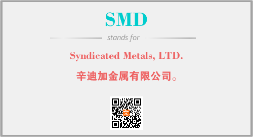 上述内容是“Syndicated Metals, LTD.”作为“SMD”的缩写,解释为“辛迪加金属有限公司。”时的信息,以及英文缩略词SMD所代表的英文单词,其对应的中文拼音、详细解释以及在英文中的流行度和相关分类、应用领域及应用示例等。