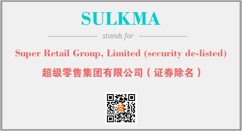 上述内容是“Super Retail Group, Limited (security de-listed)”作为“SULKMA”的缩写,解释为“超级零售集团有限公司(证券除名)”时的信息,以及英文缩略词SULKMA所代表的英文单词,其对应的中文拼音、详细解释以及在英文中的流行度和相关分类、应用领域及应用示例等。