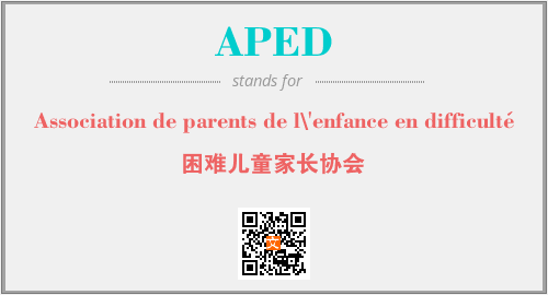 上述内容是“Association de parents de l\'enfance en difficulté”作为“APED”的缩写,解释为“困难儿童家长协会”时的信息,以及英文缩略词APED所代表的英文单词,其对应的中文拼音、详细解释以及在英文中的流行度和相关分类、应用领域及应用示例等。