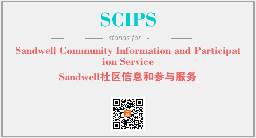上述内容是“Sandwell Community Information and Participation Service”作为“SCIPS”的缩写,解释为“Sandwell社区信息和参与服务”时的信息,以及英文缩略词SCIPS所代表的英文单词,其对应的中文拼音、详细解释以及在英文中的流行度和相关分类、应用领域及应用示例等。