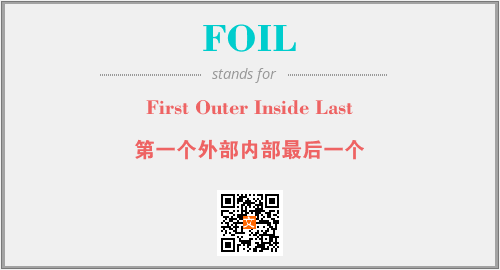 上述内容是“First Outer Inside Last”作为“FOIL”的缩写,解释为“第一个外部内部最后一个”时的信息,以及英文缩略词FOIL所代表的英文单词,其对应的中文拼音、详细解释以及在英文中的流行度和相关分类、应用领域及应用示例等。