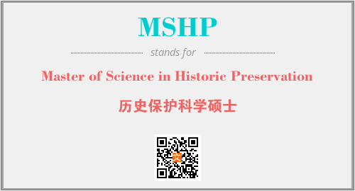 上述内容是“Master of Science in Historic Preservation”作为“MSHP”的缩写,解释为“历史保护科学硕士”时的信息,以及英文缩略词MSHP所代表的英文单词,其对应的中文拼音、详细解释以及在英文中的流行度和相关分类、应用领域及应用示例等。