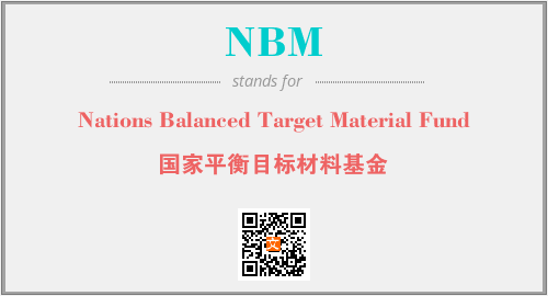 上述内容是“Nations Balanced Target Material Fund”作为“NBM”的缩写,解释为“国家平衡目标材料基金”时的信息,以及英文缩略词NBM所代表的英文单词,其对应的中文拼音、详细解释以及在英文中的流行度和相关分类、应用领域及应用示例等。