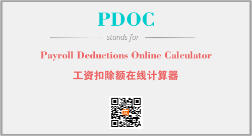 上述内容是“Payroll Deductions Online Calculator”作为“PDOC”的缩写,解释为“工资扣除额在线计算器”时的信息,以及英文缩略词PDOC所代表的英文单词,其对应的中文拼音、详细解释以及在英文中的流行度和相关分类、应用领域及应用示例等。