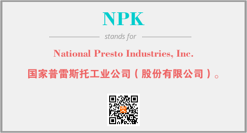上述内容是“National Presto Industries, Inc.”作为“NPK”的缩写,解释为“国家普雷斯托工业公司(股份有限公司)。”时的信息,以及英文缩略词NPK所代表的英文单词,其对应的中文拼音、详细解释以及在英文中的流行度和相关分类、应用领域及应用示例等。