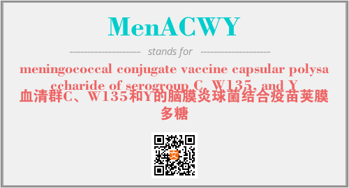 英文缩略词“MenACWY”经常作为“meningococcal conjugate vaccine capsular polysaccharide of serogroup C, W135, and Y”的英文缩写来使用,中文表示:“血清群C、W135和Y的脑膜炎球菌结合疫苗荚膜多糖”。本文将详细介绍英文缩写词MenACWY所代表英文单词,其对应的中文拼音、详细解释以及在英语中的流行度。此外,还有关于缩略词MenACWY的分类、应用领域及相关应用示例等。
