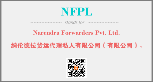 上述内容是“Narendra Forwarders Pvt. Ltd.”作为“NFPL”的缩写,解释为“纳伦德拉货运代理私人有限公司(有限公司)。”时的信息,以及英文缩略词NFPL所代表的英文单词,其对应的中文拼音、详细解释以及在英文中的流行度和相关分类、应用领域及应用示例等。