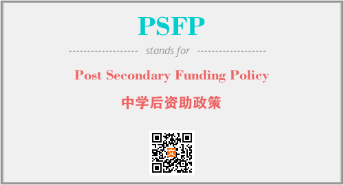 上述内容是“Post Secondary Funding Policy”作为“PSFP”的缩写,解释为“中学后资助政策”时的信息,以及英文缩略词PSFP所代表的英文单词,其对应的中文拼音、详细解释以及在英文中的流行度和相关分类、应用领域及应用示例等。