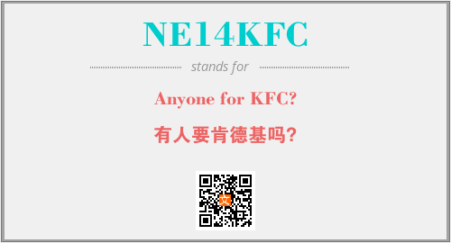 上述内容是“Anyone for KFC?”作为“NE14KFC”的缩写,解释为“有人要肯德基吗?”时的信息,以及英文缩略词NE14KFC所代表的英文单词,其对应的中文拼音、详细解释以及在英文中的流行度和相关分类、应用领域及应用示例等。