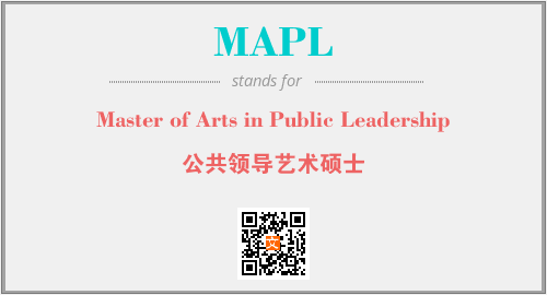 上述内容是“Master of Arts in Public Leadership”作为“MAPL”的缩写,解释为“公共领导艺术硕士”时的信息,以及英文缩略词MAPL所代表的英文单词,其对应的中文拼音、详细解释以及在英文中的流行度和相关分类、应用领域及应用示例等。