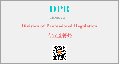 英文缩略词“DPR”经常作为“Division of Professional Regulation”的英文缩写来使用,中文表示:“专业监管处”。本文将详细介绍英文缩写词DPR所代表英文单词,其对应的中文拼音、详细解释以及在英语中的流行度。此外,还有关于缩略词DPR的分类、应用领域及相关应用示例等。