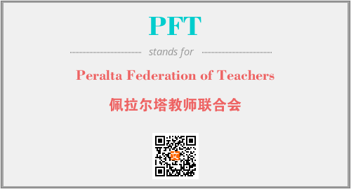 上述内容是“Peralta Federation of Teachers”作为“PFT”的缩写,解释为“佩拉尔塔教师联合会”时的信息,以及英文缩略词PFT所代表的英文单词,其对应的中文拼音、详细解释以及在英文中的流行度和相关分类、应用领域及应用示例等。