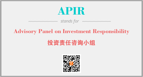 上述内容是“Advisory Panel on Investment Responsibility”作为“APIR”的缩写,解释为“投资责任咨询小组”时的信息,以及英文缩略词APIR所代表的英文单词,其对应的中文拼音、详细解释以及在英文中的流行度和相关分类、应用领域及应用示例等。