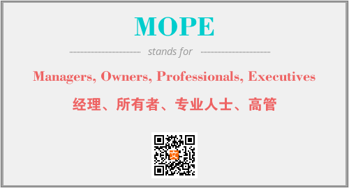 上述内容是“Managers, Owners, Professionals, Executives”作为“MOPE”的缩写,解释为“经理、所有者、专业人士、高管”时的信息,以及英文缩略词MOPE所代表的英文单词,其对应的中文拼音、详细解释以及在英文中的流行度和相关分类、应用领域及应用示例等。
