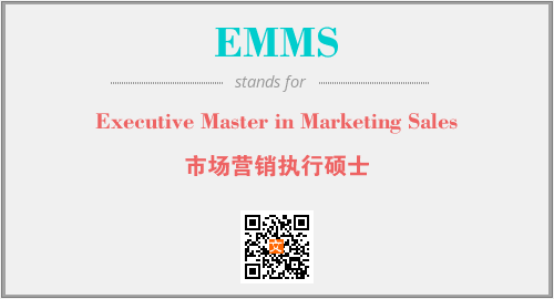 上述内容是“Executive Master in Marketing Sales”作为“EMMS”的缩写,解释为“市场营销执行硕士”时的信息,以及英文缩略词EMMS所代表的英文单词,其对应的中文拼音、详细解释以及在英文中的流行度和相关分类、应用领域及应用示例等。