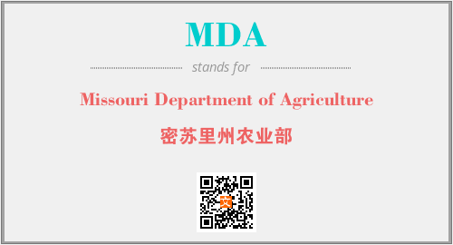 上述内容是“Missouri Department of Agriculture”作为“MDA”的缩写,解释为“密苏里州农业部”时的信息,以及英文缩略词MDA所代表的英文单词,其对应的中文拼音、详细解释以及在英文中的流行度和相关分类、应用领域及应用示例等。