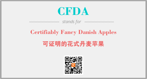 上述内容是“Certifiably Fancy Danish Apples”作为“CFDA”的缩写,解释为“可证明的花式丹麦苹果”时的信息,以及英文缩略词CFDA所代表的英文单词,其对应的中文拼音、详细解释以及在英文中的流行度和相关分类、应用领域及应用示例等。