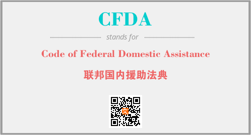 英文缩略词“CFDA”经常作为“Code of Federal Domestic Assistance”的英文缩写来使用,中文表示:“联邦国内援助法典”。本文将详细介绍英文缩写词CFDA所代表英文单词,其对应的中文拼音、详细解释以及在英语中的流行度。此外,还有关于缩略词CFDA的分类、应用领域及相关应用示例等。