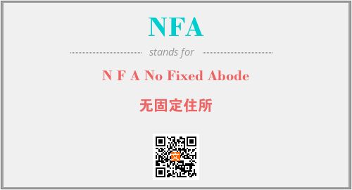 上述内容是“N F A No Fixed Abode”作为“NFA”的缩写,解释为“无固定住所”时的信息,以及英文缩略词NFA所代表的英文单词,其对应的中文拼音、详细解释以及在英文中的流行度和相关分类、应用领域及应用示例等。