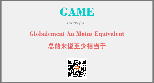 上述内容是“Globalement Au Moins Equivalent”作为“GAME”的缩写,解释为“总的来说至少相当于”时的信息,以及英文缩略词GAME所代表的英文单词,其对应的中文拼音、详细解释以及在英文中的流行度和相关分类、应用领域及应用示例等。