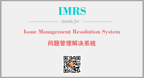 英文缩略词“IMRS”经常作为“Issue Management Resolution System”的英文缩写来使用,中文表示:“问题管理解决系统”。本文将详细介绍英文缩写词IMRS所代表英文单词,其对应的中文拼音、详细解释以及在英语中的流行度。此外,还有关于缩略词IMRS的分类、应用领域及相关应用示例等。