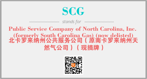 上述内容是“Public Service Company of North Carolina, Inc. (formerly South Carolina Gas) (now delisted)”作为“SCG”的缩写,解释为“北卡罗来纳州公共服务公司(原南卡罗来纳州天然气公司)(现摘牌)”时的信息,以及英文缩略词SCG所代表的英文单词,其对应的中文拼音、详细解释以及在英文中的流行度和相关分类、应用领域及应用示例等。