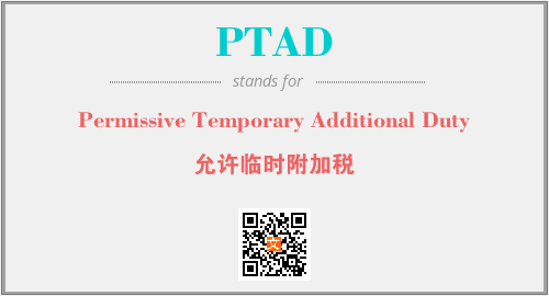 上述内容是“Permissive Temporary Additional Duty”作为“PTAD”的缩写,解释为“允许临时附加税”时的信息,以及英文缩略词PTAD所代表的英文单词,其对应的中文拼音、详细解释以及在英文中的流行度和相关分类、应用领域及应用示例等。