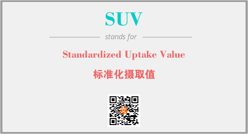上述内容是“Standardized Uptake Value”作为“SUV”的缩写,解释为“标准化摄取值”时的信息,以及英文缩略词SUV所代表的英文单词,其对应的中文拼音、详细解释以及在英文中的流行度和相关分类、应用领域及应用示例等。