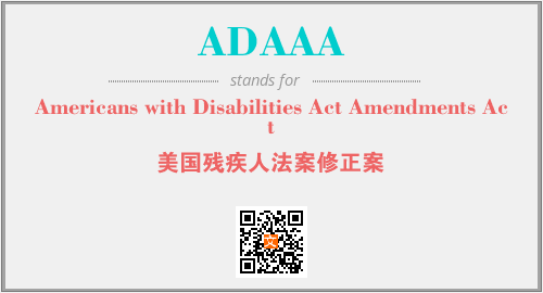 英文缩略词“ADAAA”经常作为“Americans with Disabilities Act Amendments Act”的英文缩写来使用,中文表示:“美国残疾人法案修正案”。本文将详细介绍英文缩写词ADAAA所代表英文单词,其对应的中文拼音、详细解释以及在英语中的流行度。此外,还有关于缩略词ADAAA的分类、应用领域及相关应用示例等。