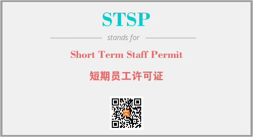 英文缩略词“STSP”经常作为“Short Term Staff Permit”的英文缩写来使用,中文表示:“短期员工许可证”。本文将详细介绍英文缩写词STSP所代表英文单词,其对应的中文拼音、详细解释以及在英语中的流行度。此外,还有关于缩略词STSP的分类、应用领域及相关应用示例等。