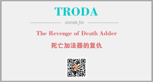 上述内容是“The Revenge of Death Adder”作为“TRODA”的缩写,解释为“死亡加法器的复仇”时的信息,以及英文缩略词TRODA所代表的英文单词,其对应的中文拼音、详细解释以及在英文中的流行度和相关分类、应用领域及应用示例等。