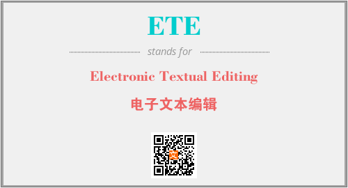 英文缩略词“ETE”经常作为“Electronic Textual Editing”的英文缩写来使用,中文表示:“电子文本编辑”。本文将详细介绍英文缩写词ETE所代表英文单词,其对应的中文拼音、详细解释以及在英语中的流行度。此外,还有关于缩略词ETE的分类、应用领域及相关应用示例等。