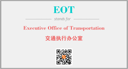 英文缩略词“EOT”经常作为“Executive Office of Transportation”的英文缩写来使用,中文表示:“交通执行办公室”。本文将详细介绍英文缩写词EOT所代表英文单词,其对应的中文拼音、详细解释以及在英语中的流行度。此外,还有关于缩略词EOT的分类、应用领域及相关应用示例等。