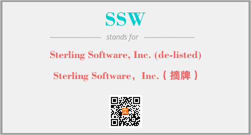 英文缩略词“SSW”经常作为“Sterling Software, Inc. (de-listed)”的英文缩写来使用,中文表示:“Sterling Software,Inc.(摘牌)”。本文将详细介绍英文缩写词SSW所代表英文单词,其对应的中文拼音、详细解释以及在英语中的流行度。此外,还有关于缩略词SSW的分类、应用领域及相关应用示例等。