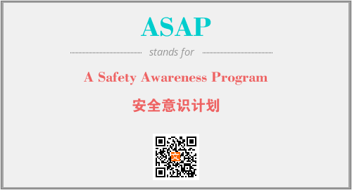上述内容是“A Safety Awareness Program”作为“ASAP”的缩写,解释为“安全意识计划”时的信息,以及英文缩略词ASAP所代表的英文单词,其对应的中文拼音、详细解释以及在英文中的流行度和相关分类、应用领域及应用示例等。