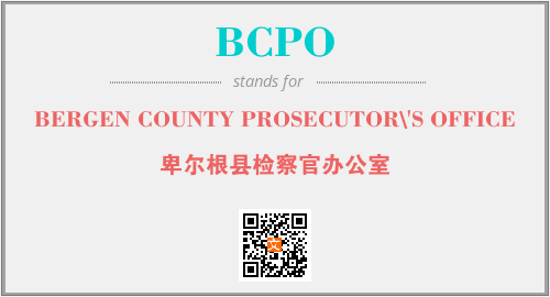 上述内容是“BERGEN COUNTY PROSECUTOR\'S OFFICE”作为“BCPO”的缩写,解释为“卑尔根县检察官办公室”时的信息,以及英文缩略词BCPO所代表的英文单词,其对应的中文拼音、详细解释以及在英文中的流行度和相关分类、应用领域及应用示例等。