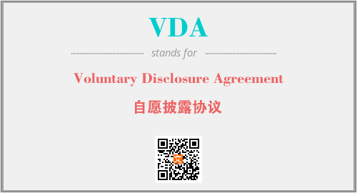 英文缩略词“VDA”经常作为“Voluntary Disclosure Agreement”的英文缩写来使用,中文表示:“自愿披露协议”。本文将详细介绍英文缩写词VDA所代表英文单词,其对应的中文拼音、详细解释以及在英语中的流行度。此外,还有关于缩略词VDA的分类、应用领域及相关应用示例等。