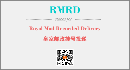 英文缩略词“RMRD”经常作为“Royal Mail Recorded Delivery”的英文缩写来使用,中文表示:“皇家邮政挂号投递”。本文将详细介绍英文缩写词RMRD所代表英文单词,其对应的中文拼音、详细解释以及在英语中的流行度。此外,还有关于缩略词RMRD的分类、应用领域及相关应用示例等。