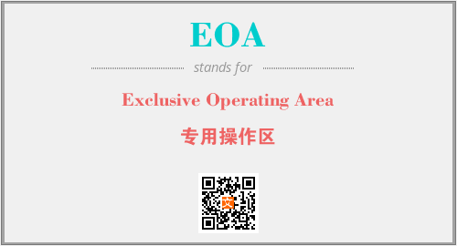 英文缩略词“EOA”经常作为“Exclusive Operating Area”的英文缩写来使用,中文表示:“专用操作区”。本文将详细介绍英文缩写词EOA所代表英文单词,其对应的中文拼音、详细解释以及在英语中的流行度。此外,还有关于缩略词EOA的分类、应用领域及相关应用示例等。