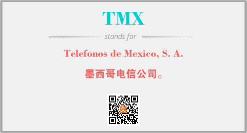 上述内容是“Telefonos de Mexico, S. A.”作为“TMX”的缩写,解释为“墨西哥电信公司。”时的信息,以及英文缩略词TMX所代表的英文单词,其对应的中文拼音、详细解释以及在英文中的流行度和相关分类、应用领域及应用示例等。