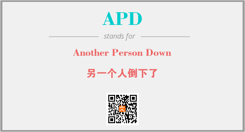 上述内容是“Another Person Down”作为“APD”的缩写,解释为“另一个人倒下了”时的信息,以及英文缩略词APD所代表的英文单词,其对应的中文拼音、详细解释以及在英文中的流行度和相关分类、应用领域及应用示例等。