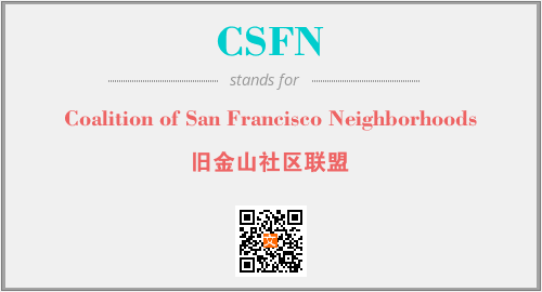 上述内容是“Coalition of San Francisco Neighborhoods”作为“CSFN”的缩写,解释为“旧金山社区联盟”时的信息,以及英文缩略词CSFN所代表的英文单词,其对应的中文拼音、详细解释以及在英文中的流行度和相关分类、应用领域及应用示例等。