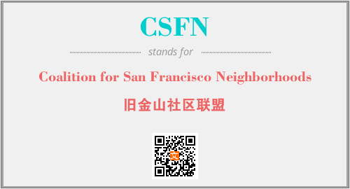 上述内容是“Coalition for San Francisco Neighborhoods”作为“CSFN”的缩写,解释为“旧金山社区联盟”时的信息,以及英文缩略词CSFN所代表的英文单词,其对应的中文拼音、详细解释以及在英文中的流行度和相关分类、应用领域及应用示例等。